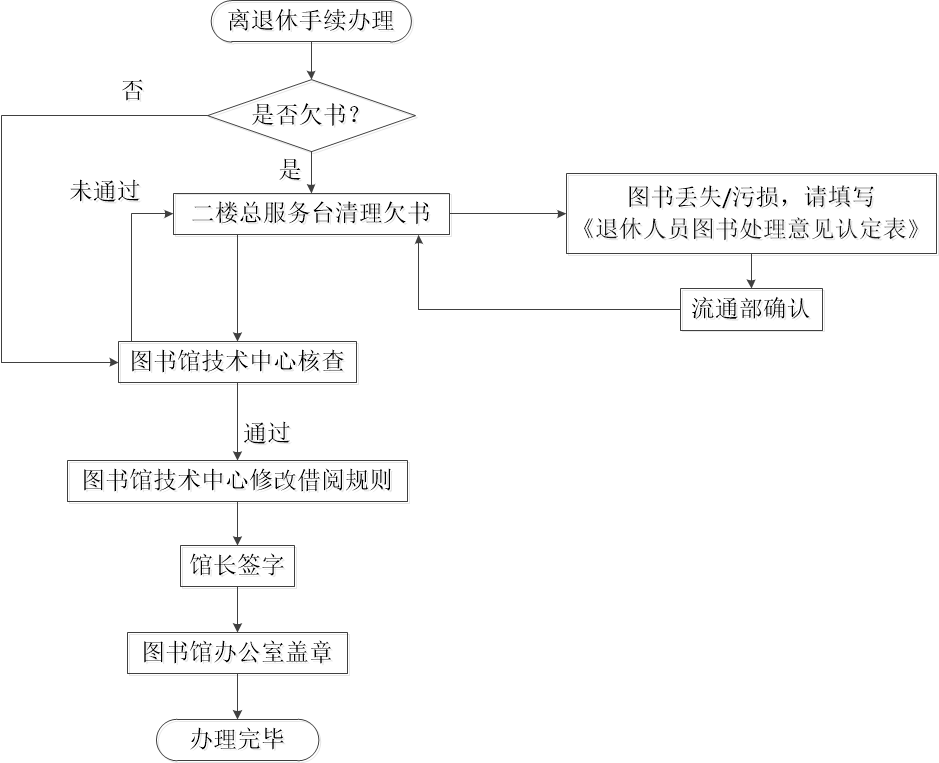 1、退休人员办理离职手续须首先归还所借图书馆全部图书资源。请到图书馆总服务台办理还书事项。